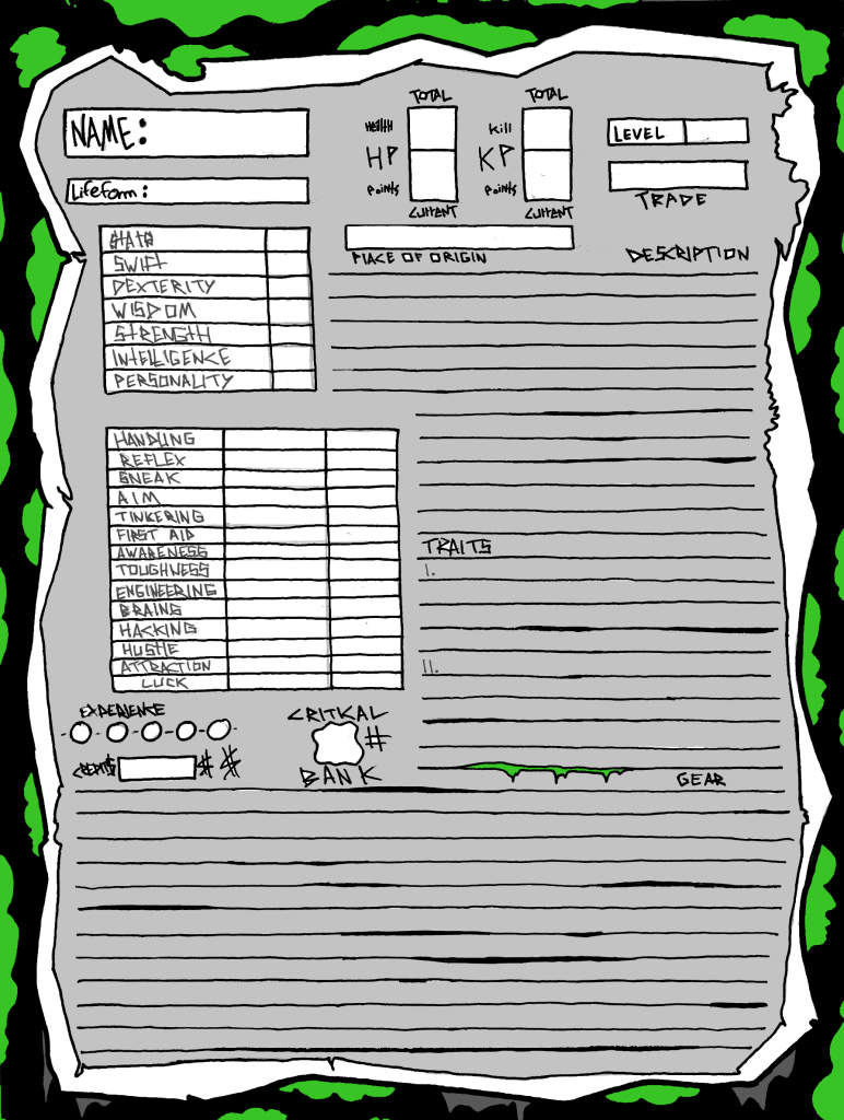 Once you have the character you wish to create finalized, start filling in your character sheet. Don’t worry about the stats right now; we’ll go over the details afterwards. Start by filling in your character’s, Name, Lifeform, Place of Origin, and Description. Place of Origin may have added benefits by granting players certain affiliations and advanced knowledge of a certain area, discuss this with the GM if necessary